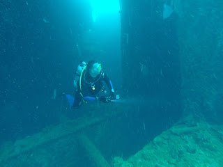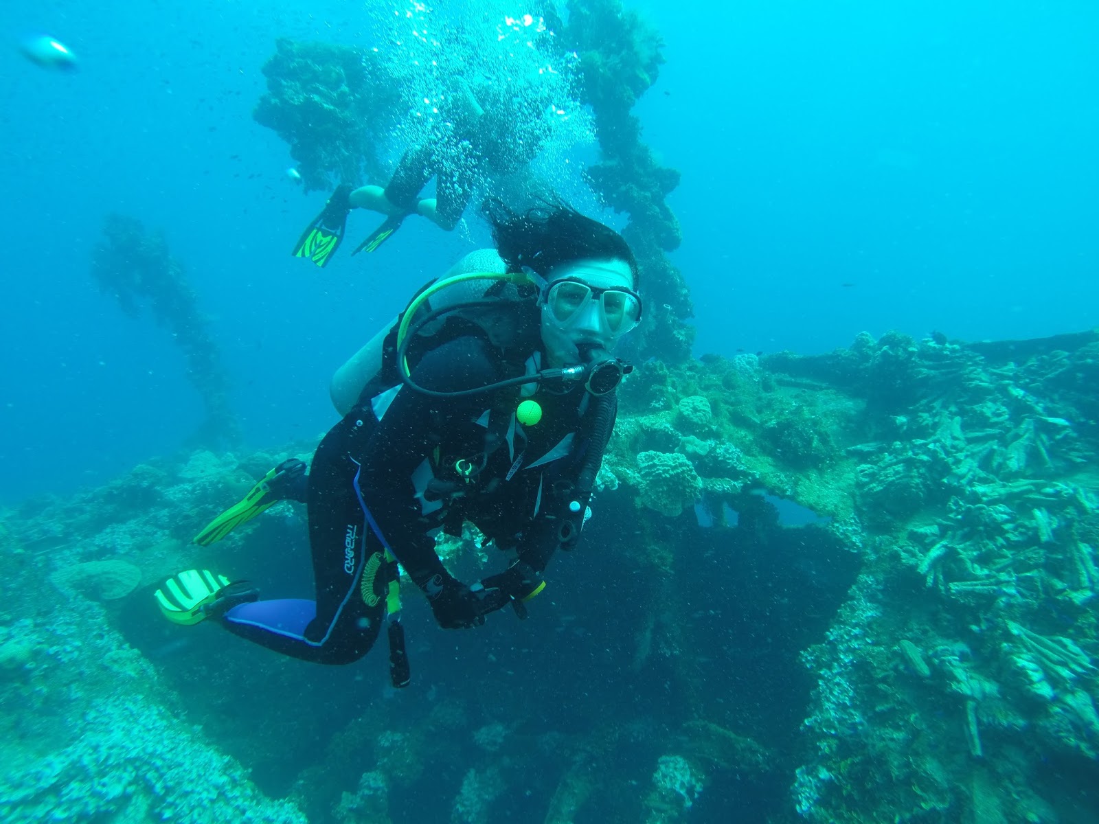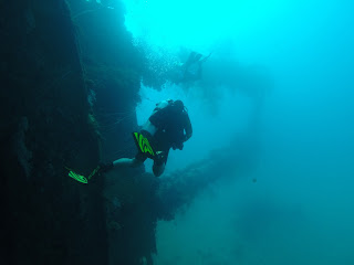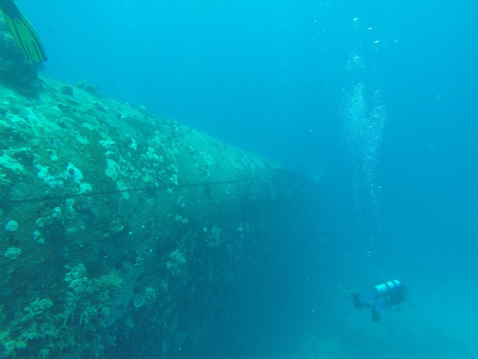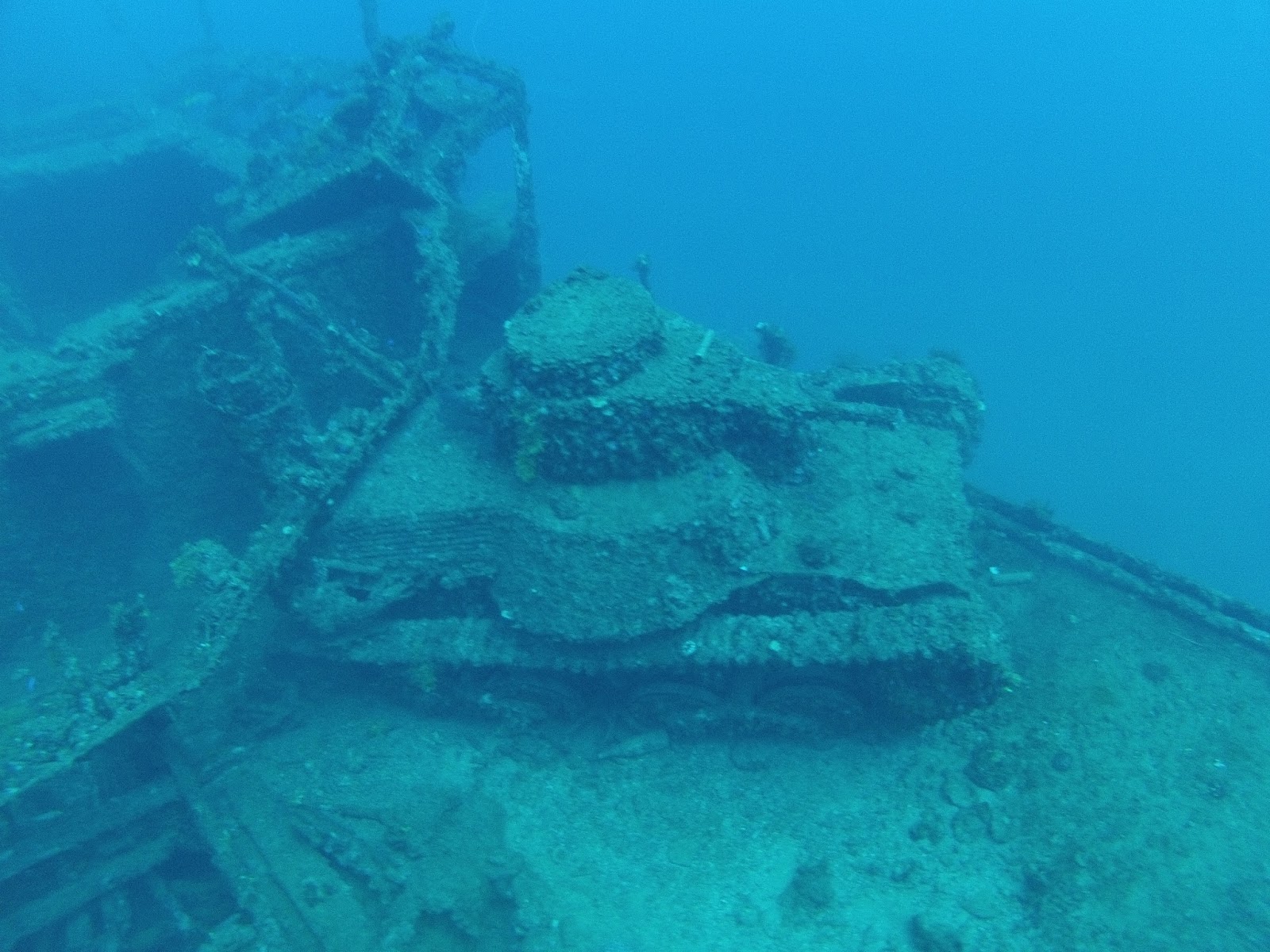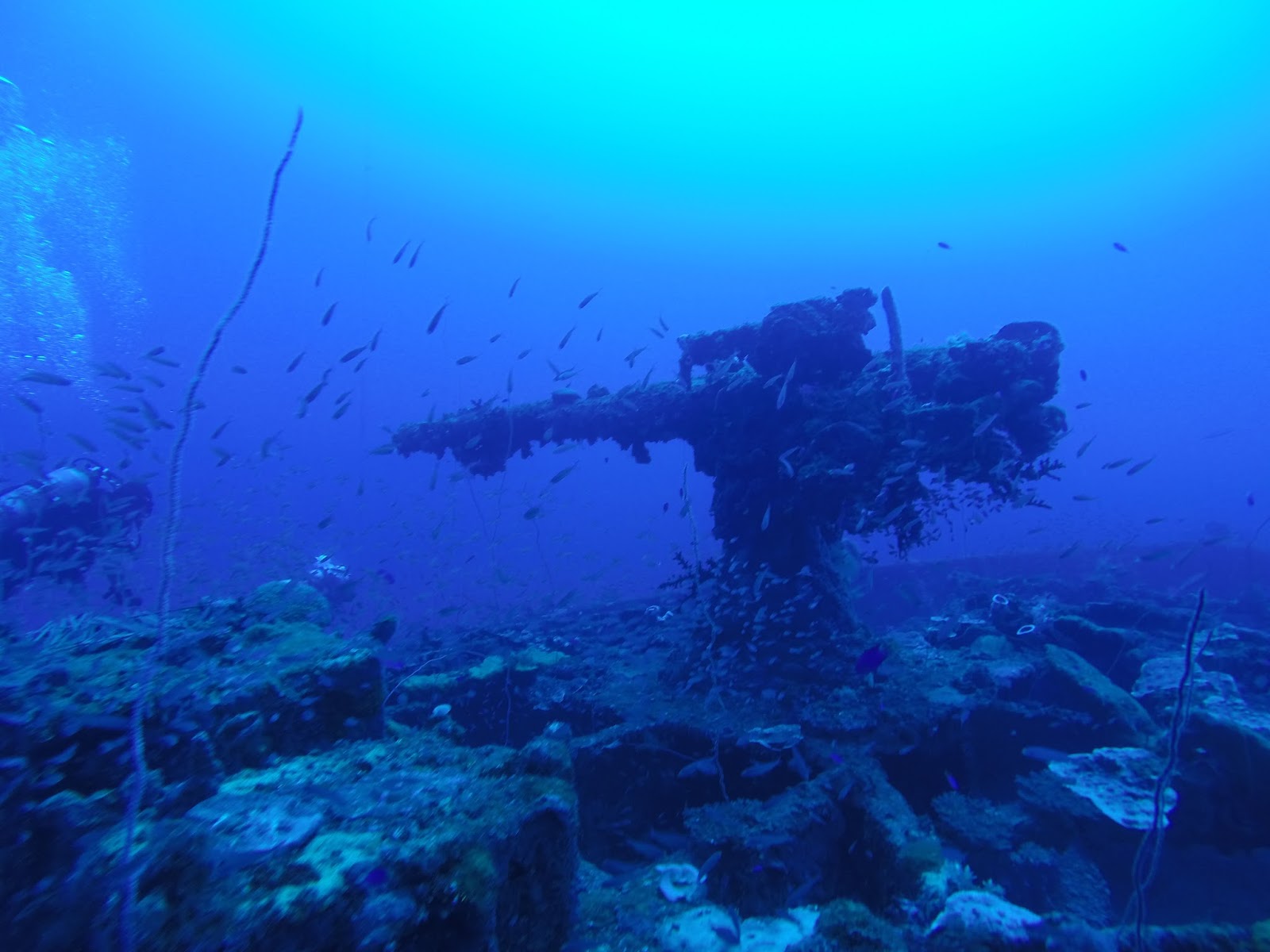 Czas na kolejny wrak. W czasach swoje świetności załogę statku stanowiło 150 członków załogi i 1140 pasażerów. Rio de Janeiro Maru – pasażerski liniowiec o długości 140m. zaatakowany w dniu 17 lutego przez USS Yorktown i USS Bunker Hill dostał bezpośrednie trafienie i zatonął około północy w dniu 18 lutego. Leży na prawej burcie na wschodniej stronie wyspy Uman na głębokości 12-24m a przy dnie nawet 33m. Wybuch rozerwał kadłub tworząc kilka otworów widocznych na zewnątrz na dziobie. Płynąc wzdłuż kadłuba docieramy do rufy obserwujemy działo a poniżej przy dnie śruby. Wewnątrz wraku obserwacje i zwiedzanie maszynowni. Ogromne działo na rufie, w lądowniach wiele butelek piwa, kilka dużych elementów dział