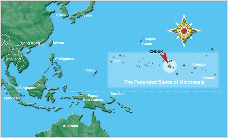 Nasz „atak” na Truk (obecnie Chu’uk) leżący około 2093 km na południowy wschód od Japonii i 161 km na północ od Papui Nowej Gwinei, to chęć zobaczenia pod wodą dziewiczej, nienaruszonej, przebogatej rafy, gdzie przy fantastycznej przejrzystości wody występują żółwie, rekiny, płaszczki, lobstery…….no i oczywiście penetracja największego wrakowiska na świecie, miejsca będącego pragnieniem wielu nurków. Przeżycie nowej fascynującej przygody oraz wykonanie zdjęć i filmów to też cel naszej wyprawy. Wyprawa MDT, po wielogodzinnym locie z Pragi poprzez Seul i Guam dociera na Weno jedną z wysp archipelagu Truk. Mikronezja oznacza „małe wyspy”, a leżąca w zachodniej części Oceanu Spokojnego i obejmująca krainy leżące we wschodniej i środkowej części archipelagu Karolinów to ponad 600 maleńkich, rozrzuconych na rozległym obszarze wysp wulkanicznych i atoli koralowych. W skład Federacji Mikronezji wchodzą nizinne wyspy pochodzenia wulkanicznego. Od północy graniczy z Marianami Północnymi i Guam, od zachodu z Palau, od południa z Papuą Nową Gwineą, a od wschodu z Nauru, Kiribati i Wyspami Marshalla.