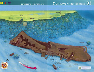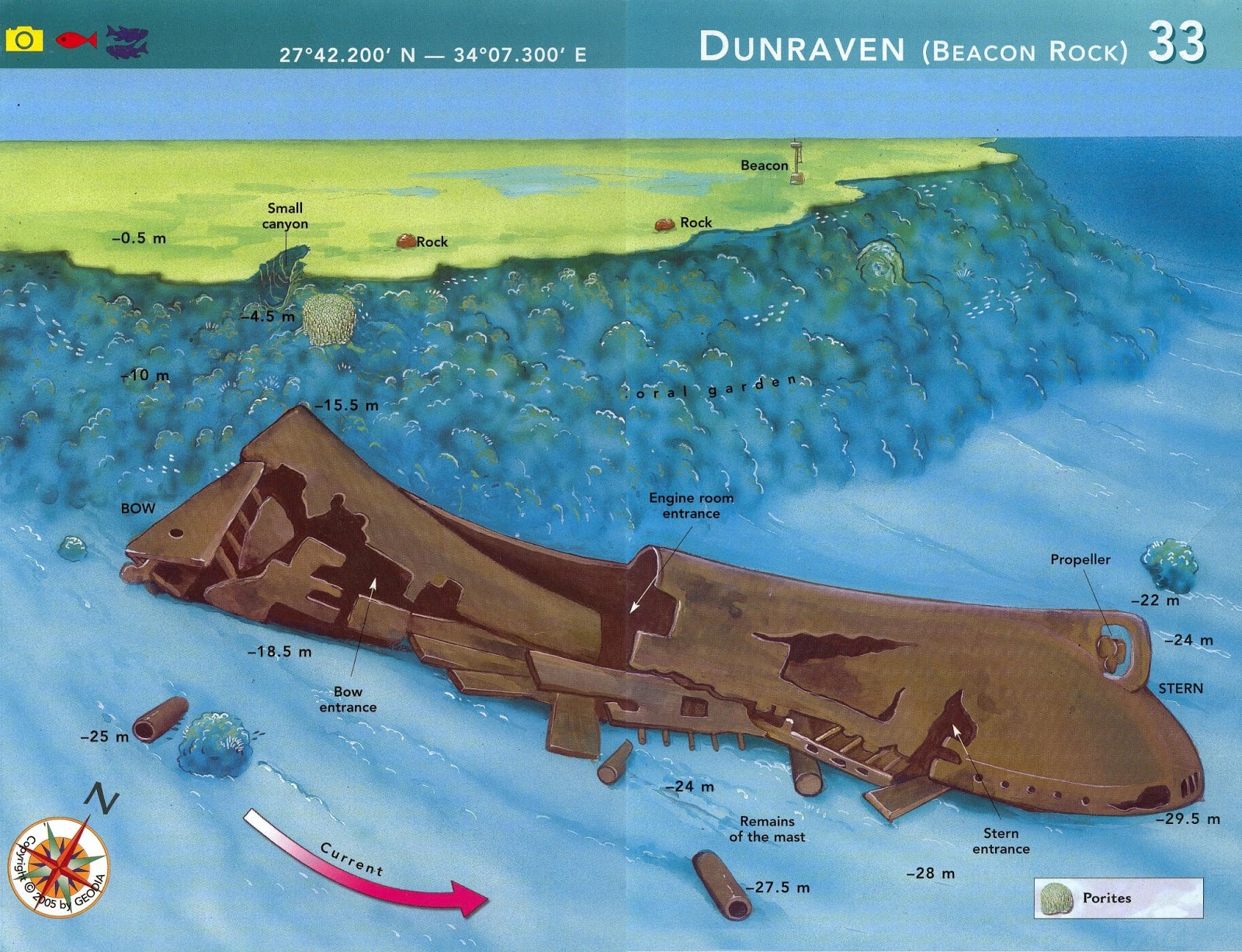 Na razie płyniemy na północ, przed nami: DUNRAVEN – to parowiec, który służył do transportu przypraw korzennych oraz drewna. Zatonął przy rafie Sha’b Mahmud 25 kwietnia 1876 r. podczas swojego ostatniego rejsu z ładunkiem bawełny i wełny z Bombaju w Indiach do Newcastle po rzekomej pijackiej dyspucie pomiędzy kapitanem, jego żoną a pierwszym oficerem. Dwie części przełamanego na pół statku leżą osobno – część rufowa na głębokości 28 m, a dziób na 18m. Przycumowani do stałego punku (boi) zanurzamy się w kierunku wraku by wpłynąć przez szpary w kadłubie na prawą burcie.