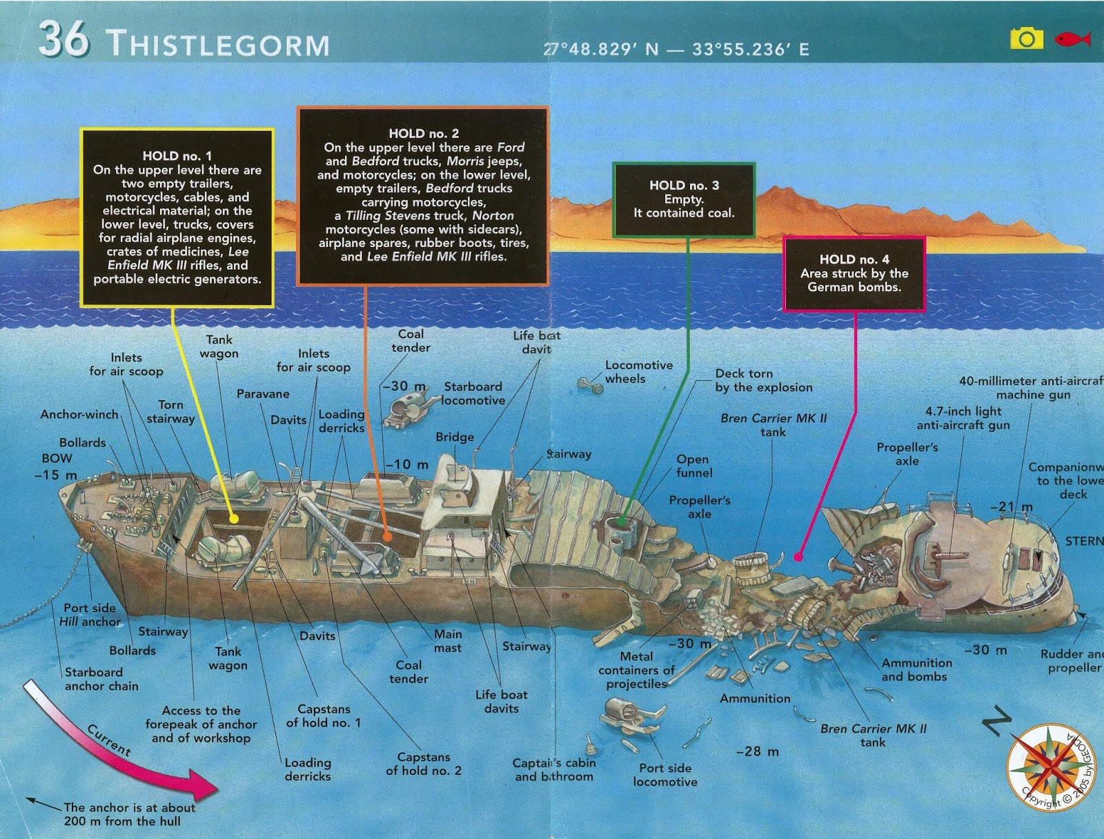 Trzy nurkowania odbywamy na wraku SS Thistlegorm, THISTLEGORM prawdopodobnie najbardziej znany wrak na Morzu Czerwonym. Ten brytyjski frachtowiec był źródłem zaopatrzenia dla Ósmej Armii Brytyjskiej stacjonującej w Aleksandrii w Północnej Afryce i przygotowującej się do operacji Crusader. Historia THISTLEGORM’A jest krótka, ale fascynująca. Statek został zbudowany na przełomie 1939/40 roku przez firmę „North Eastern Marine Engineering Co. Ltd of Sunderland” a zwodowany w celu dołączenia do wysiłku zbrojnego II Wojny Światowej w dniu 9-go kwietnia 1940r. Była to średnia jednostka transportująca, o wymiarach 415 x 58 x 25 stóp i wyporności 4898 ton. W czasie gdy wodowano statek, panował ogólny deficyt uzbrojenia, dlatego też został on wyposażony jedynie w 4,7 calowe (120 mm) działo przeciwlotnicze i ciężki karabin maszynowy kalibru 3,8 cala – obie bronie były pozostałościami z I. Wojny Światowej.